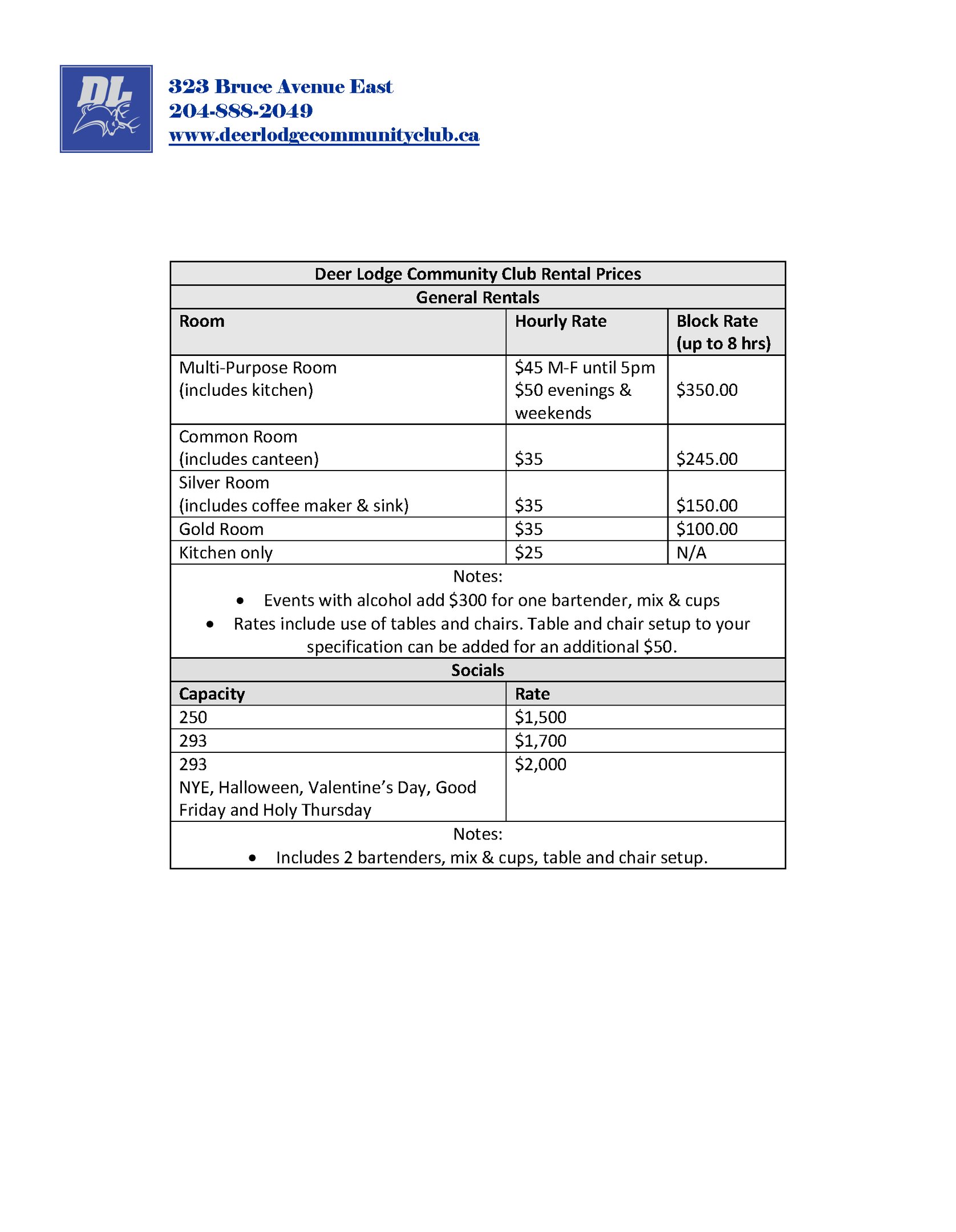 To rent the facility please contact the club via email at: rentals@deerlodgecommunityclub.ca
